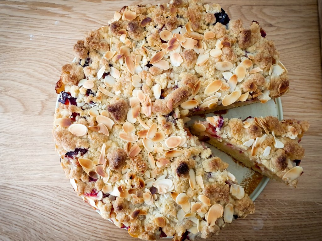 - Die Masse in die eingefettete Form geben und Äpfel und Zwetscheken darauf verteilen. Die Streusel mit den Finger gleichmäßig auf den Früchten verteilen. Zum Schluss noch die Mandelblättchen darüber streuen.